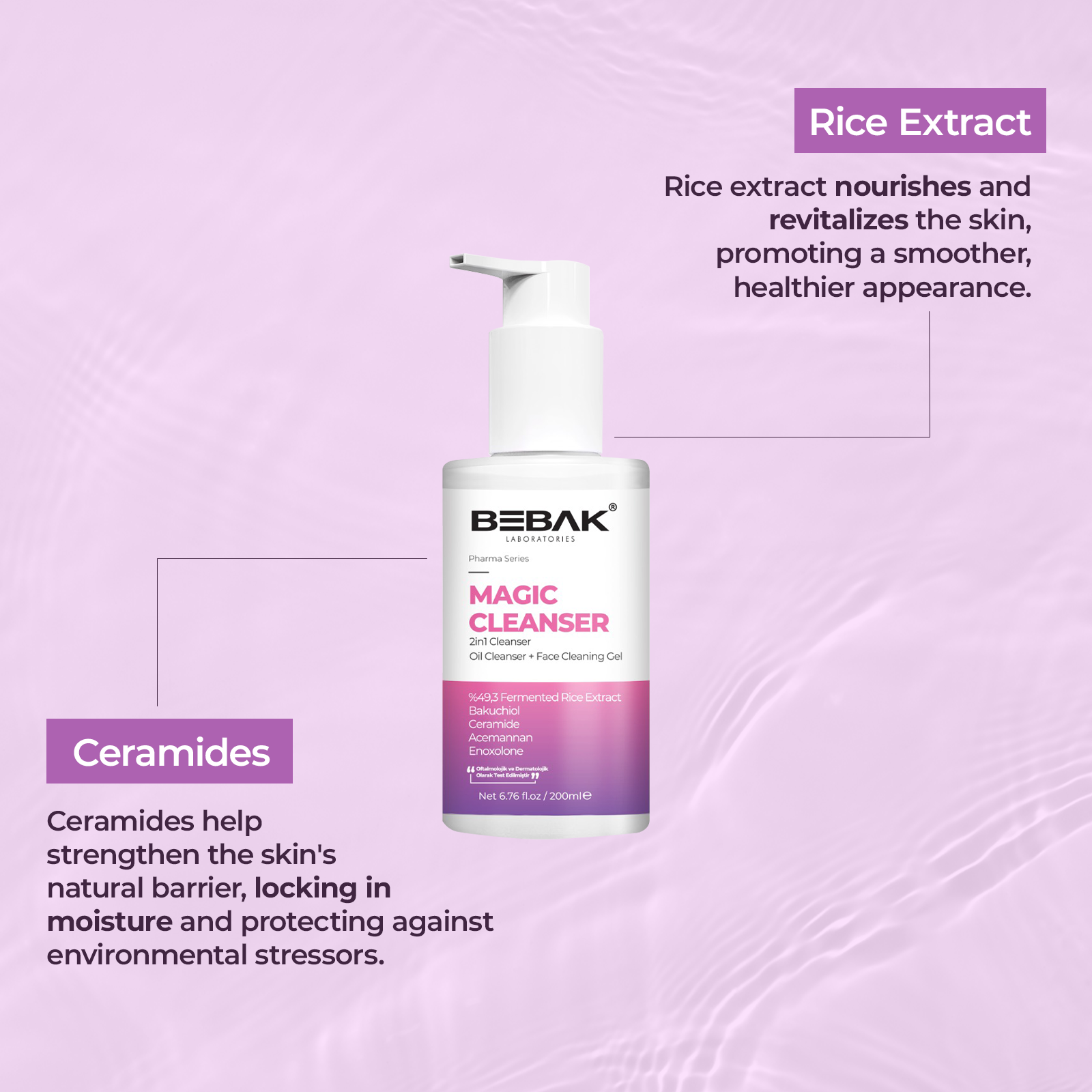 Ingredients: Aqua, Lactobacillus/Rice Ferment Filtrate, Lauryl Glucoside, Peg-7 Glyceryl Cocoate, Glycerin, Decyl Glucoside, Sunfloweroyl Methylglucamide, Acrylates Copolymer, Glycol Distearate, Bakuchiol, Ceramide Np, Tocopherol, Glycyrrhetinic Acid, Lactobacillus/Aloe Barbadensis Ferment Filtrate, Hydrogenated Palm Glycerides Citrate, Beta-Glucan, Xylitol, Glucomannan, Butylene Glycol, Propylene Glycol, Coco-Glucoside, Caprylyl/Capryl Glucoside, Glyceryl Oleate, Polyglyceryl-10 Laurate, Sodium Lauroyl Glutamate, Styrene/Acrylates Copolymer, Parfum, Citric Acid, Sodium Hydroxide, Phenoxyethanol, Benzoic Acid, Benzyl Alcohol, Caprylyl Glycol, Dehydroacetic Acid, Didecyldimonium Chloride, Methylpropanediol